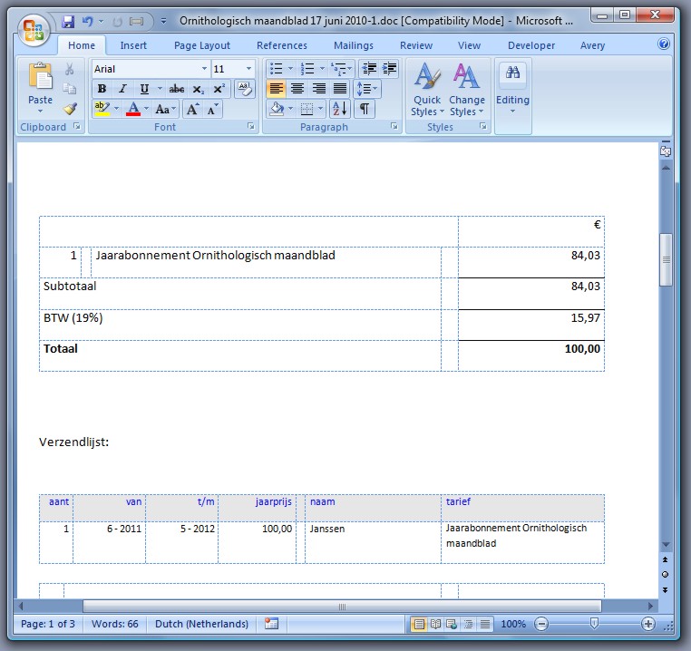 voorbeeld van de verzendlijst voor het ornithologisch maandblad in Excel. U