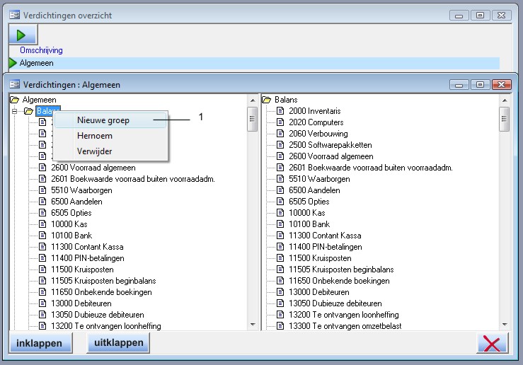 het schema: ‘algemeen’ geopend. Door met de rechtermuisknop op ‘balans’ (zie 1)
