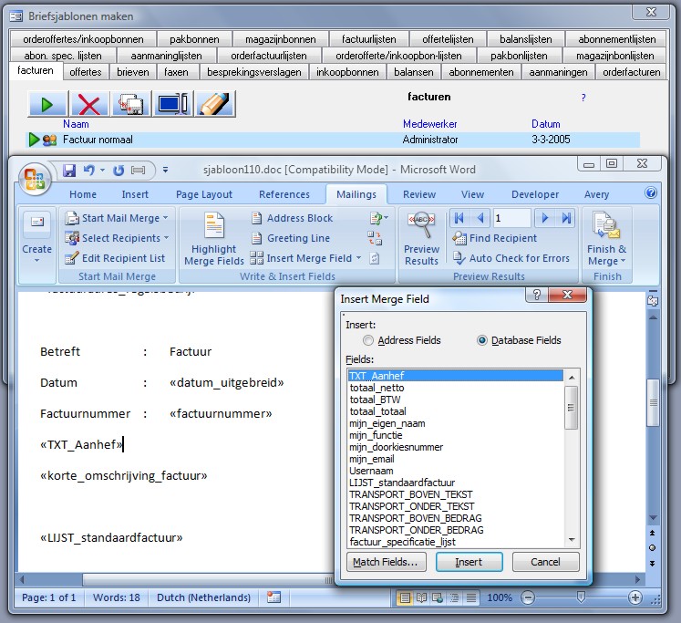 ‘TXT_Totaal_euros’) en deze in een tabel in de factuursjabloon te plaatsen.