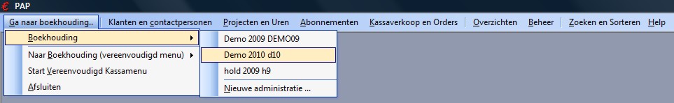 boekhoudmenu is gekoppeld aan een vooraf gekozen boekhoudkundig jaar en administratie.